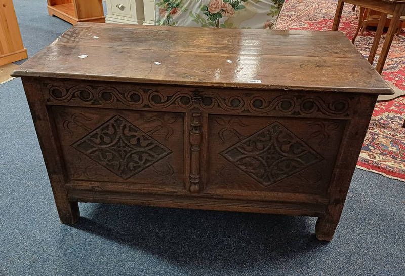 Late 18th or early 19th century oak coffer with carved decoration - 60 cm tall x 108 cm long