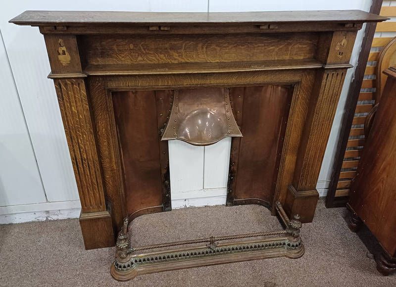 Arts & crafts fire place, the copper hearth with oak surround with inlaid dutch child motifs. the metal & brass fender with pierced & twist decoration - 131 cm tall x 159 cm wide