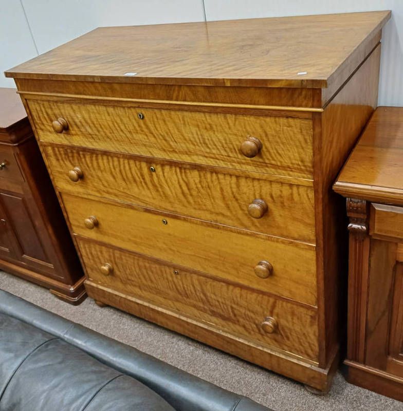 19th century satin birch chest of 4 drawers on bun feet 120 cm tall x 119 cm wide