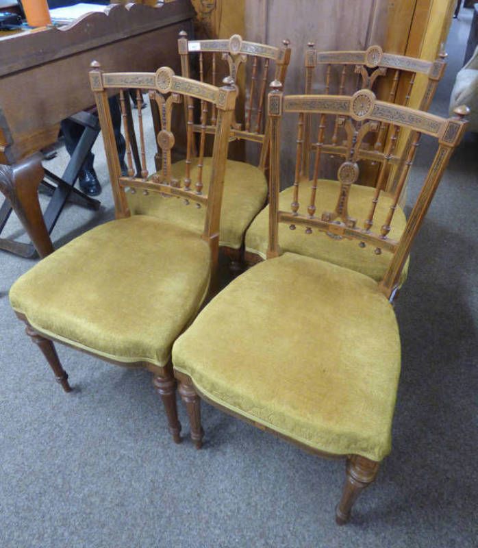Set of 4 late 19th or early 20th century satinwood dining chairs with decorative carving & inlay on turned supports