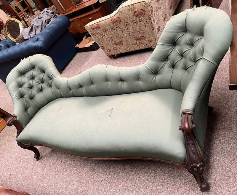 19th century mahogany framed button back settee on carved cabriole supports, 225cm long