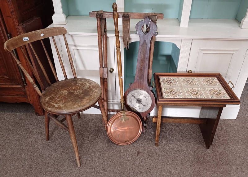 20th century rosewood barometer frame, mahogany butler's tray stand, copper bed warmer, etc