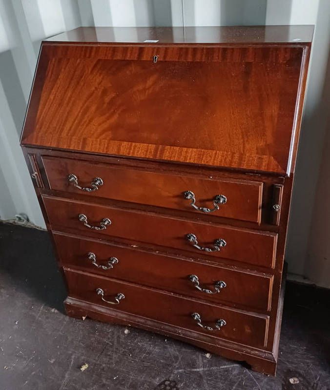 Late 20th century mahogany bureau with fall front over 4 drawers on bracket supports - 100 cm tall x 75 cm wide