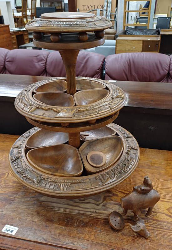 Carved wooden 3 tier lazy susan with animal decoration