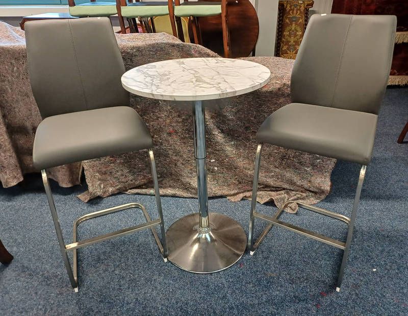 Faux marble topped rise and fall circular pedestal table & pair of cantilever stools