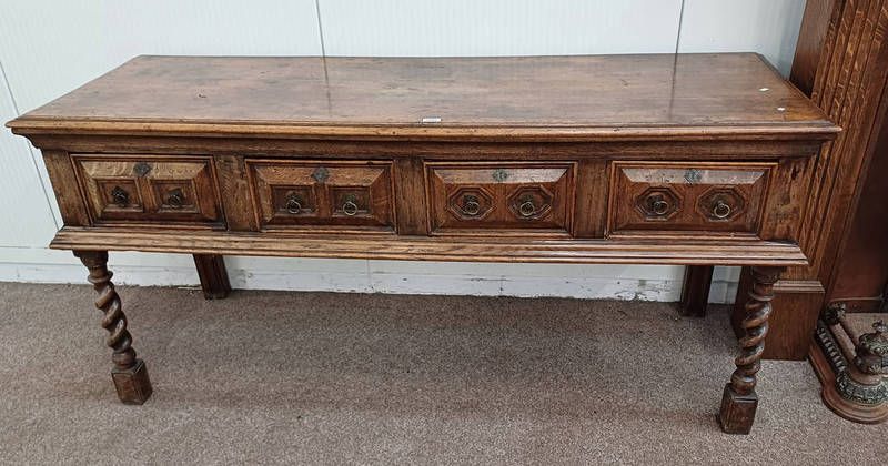 Late 18th or early 19th century oak side table with 4 drawers on barley twist supports - 177 cm wide
