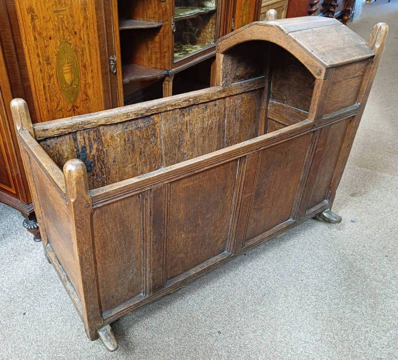 19th century oak crib with panelled decoration on rocking supports - 109 cm long