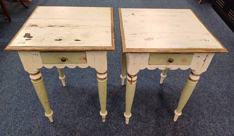 Pair of rustic painted single drawer bedside tables on turned supports - 76 cm tall