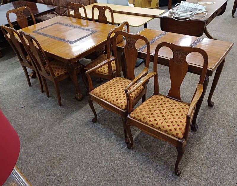 Eastern hardwood extending dining table with extra leaf on paw feet & set of 8 dining chairs including 2 armchairs