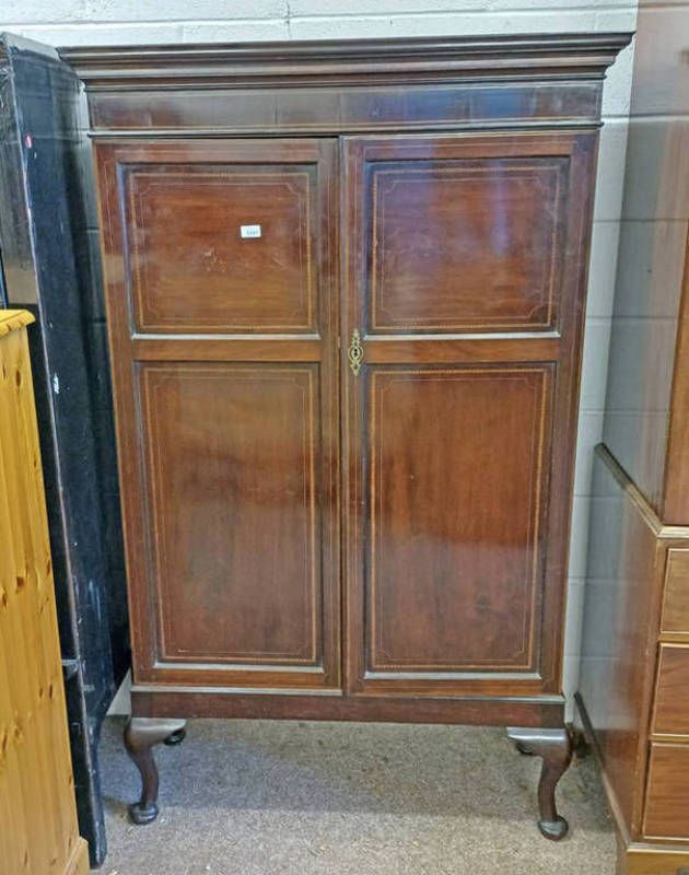 Late 19th century mahogany 2 door cabinet with decorative feather banding on queen anne supports, 171cm tall x 105cm wide