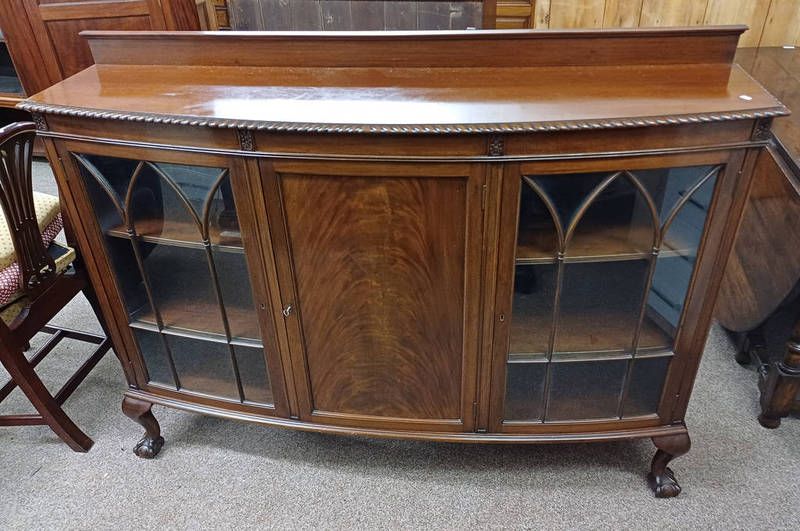 20th century mahogany display cabinet with central panel door flanked by 2 glazed panel doors on ball & claw supports - 153 cm wide