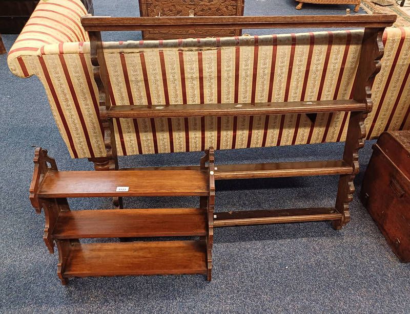 Oak wall hanging plate rack & mahogany shelf - largest 93 cm tall x 100 cm wide