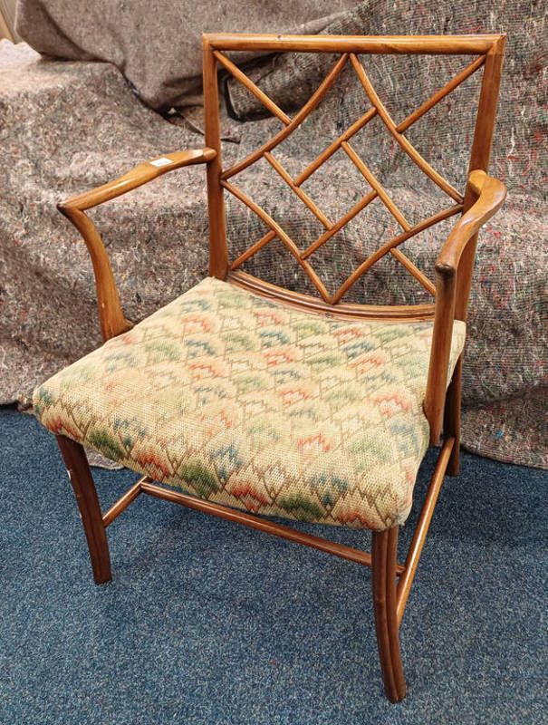 Chippendale style cockpen open armchair with floral tapestry seat on square supports
