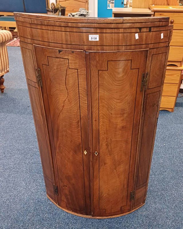 19th century walnut bow front corner cabinet with 2 doors and ebony line inlay - 118 cm tall