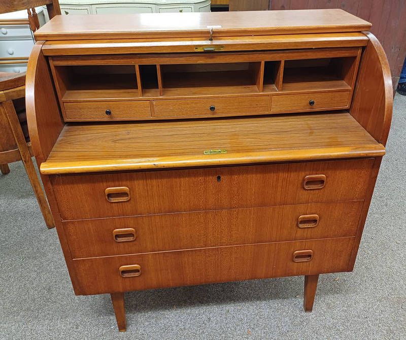 Swedish teak roll top desk in the style of egon ostergaard, the roll top opening to fitted interior with pull out slide over 3 drawers with square tapering supports - 97 cm tall