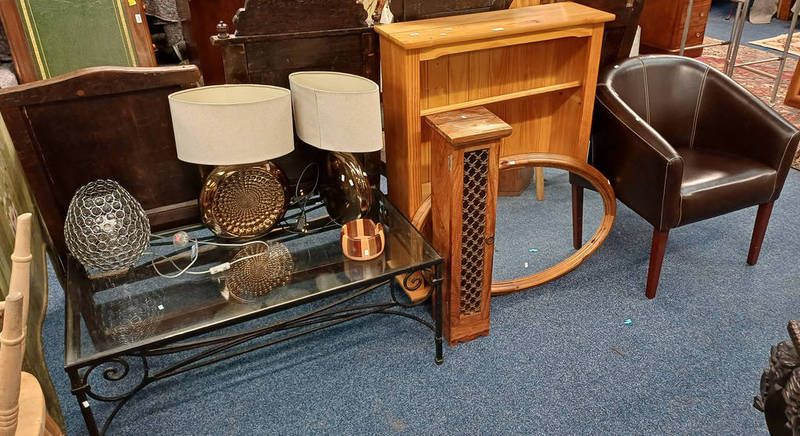Pine open bookcase, pair of decorative table lamps, glass topped coffee table, etc.