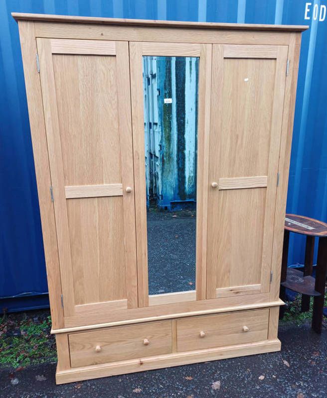 Modern oak wardrobe with central mirror flanked by two panel doors with single drawers below - 190 cm tall x 140 cm wide