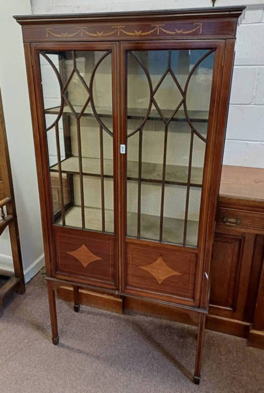Late 19th century inlaid mahogany display case on square tapered supports, 178cm tall