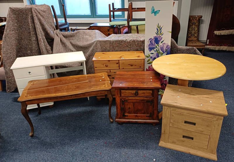 Beechwood circular pedestal kitchen table, desk, hardwood bedside cabinet, etc.