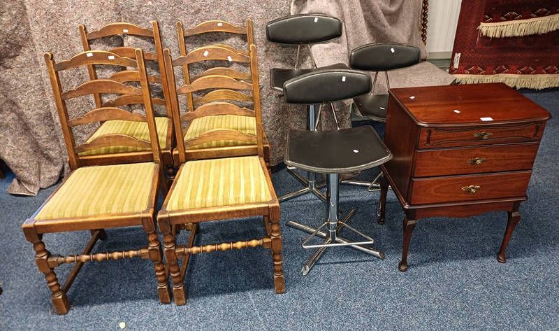 Set of 4 oak dining chairs, bedside chest with lift lid top & 2 drawers, etc.