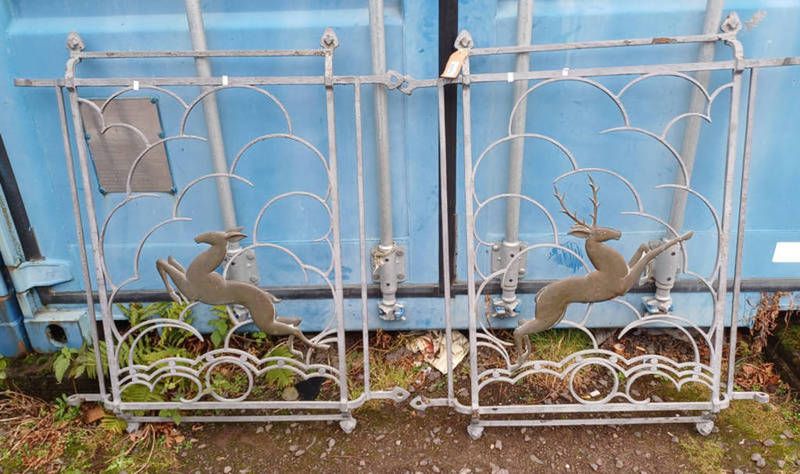 Pair of cast iron window guards in the art deco style with brass stag & doe motifs - 109 cm tall x 91 cm wide
