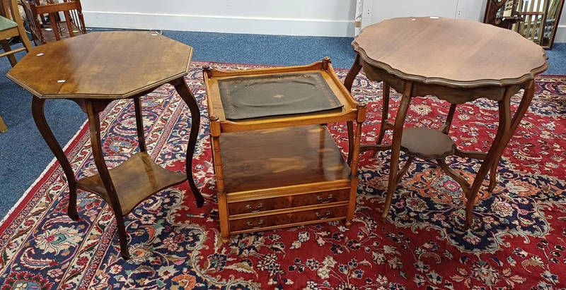 Yew wood lamp table with single drawers & 2 mahogany tables
