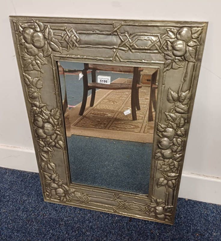 Embossed silvered metal framed mirror with bevelled edge - glass dimensions 48 cm x 30 cm