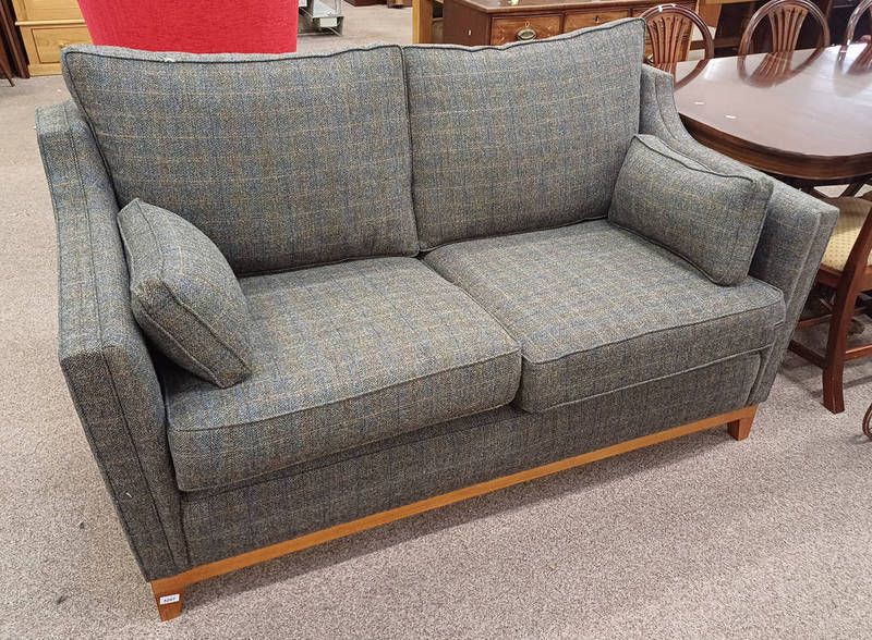 19th century regency inlaid mahogany framed scroll arm settee upholstered with anta tartan fabric