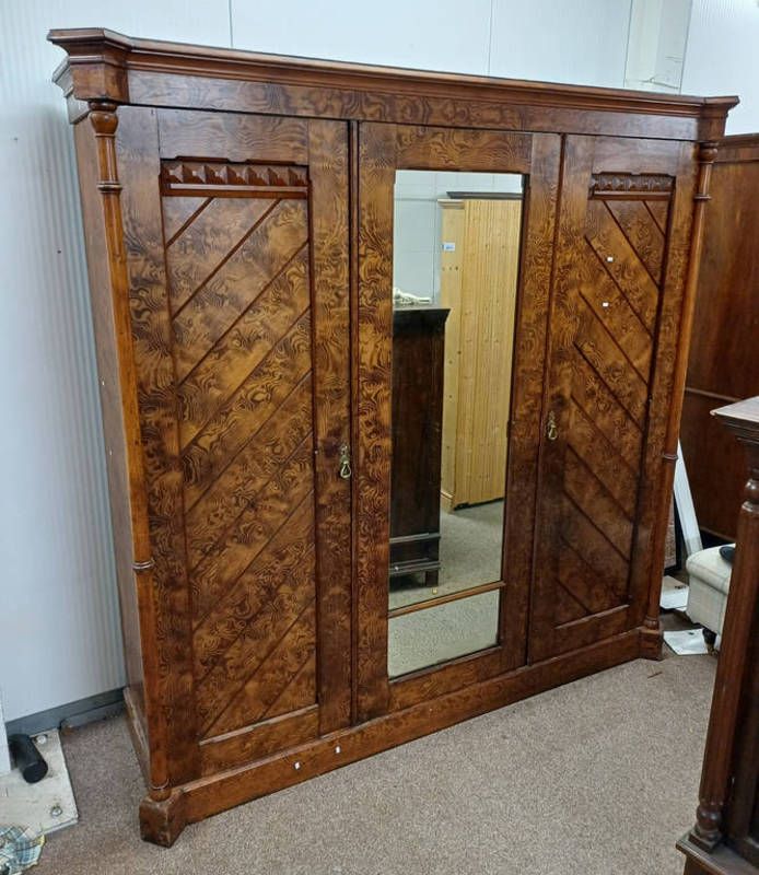 19th century pine wardrobe with centrally set mirror door flanked by 2 panel doors on plinth base - 206 cm tall x 212 cm wide