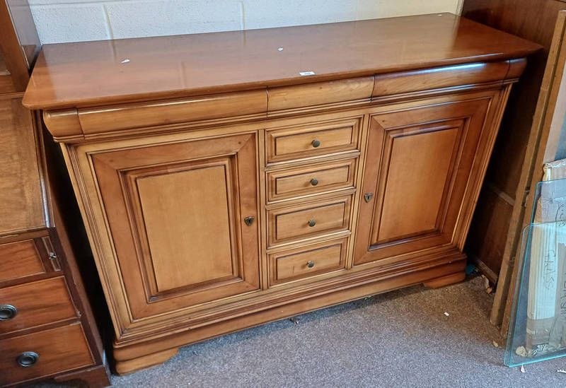 Modern hardwood sideboard with 4 centrally set drawers flanked by 2 panel doors with 3 frieze drawers above - 149 cm long