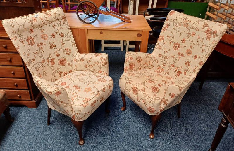 Pair of armchairs on mahogany queen anne supports, 92cm tall