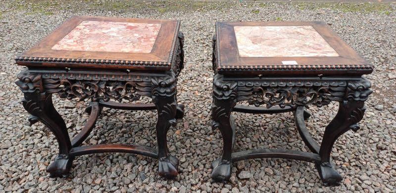Pair of oriental carved hardwood square occasional tables with pink marble inserts on shaped supports - 46 cm tall x 42 cm wide