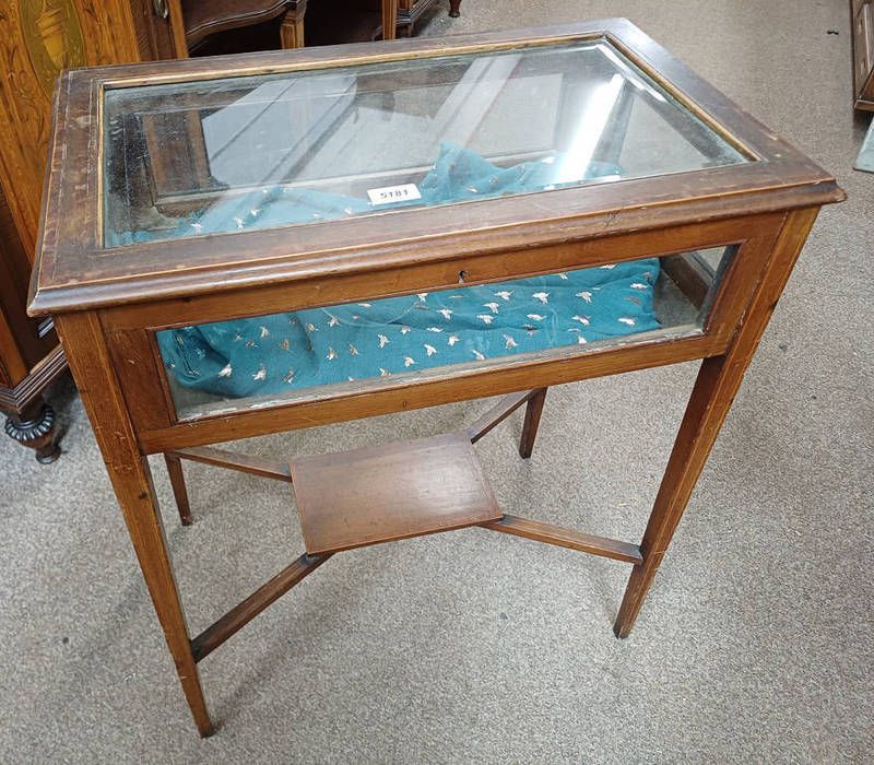 Edwardian mahogany bijouterie table with lift-up top, inlaid decoration & square tapering supports