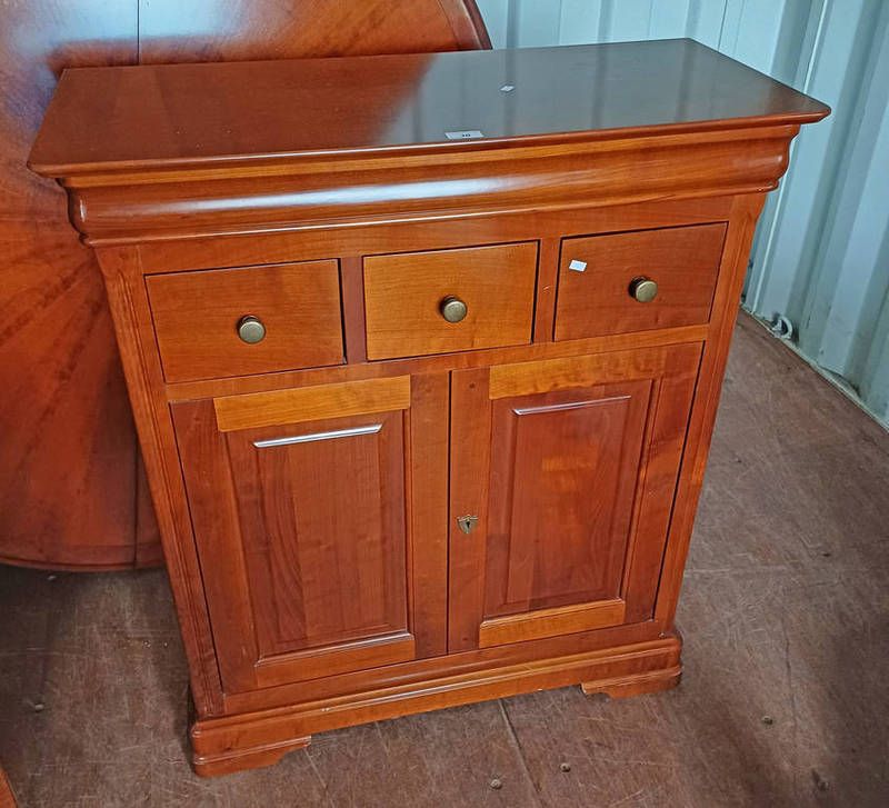Modern hardwood side cabinet with 3 drawers over 2 panel doors with single frieze drawer above on bracket supports - 100 cm tall x 88 cm wide