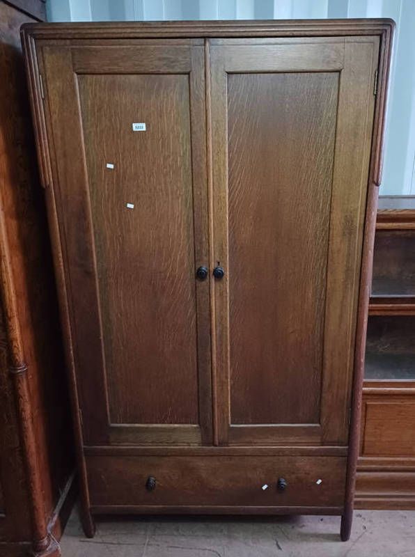 Early 20th century oak 2 door wardrobe with single drawer to base attributed to bath cabinet makers - 186 cm tall x 106 cm wide