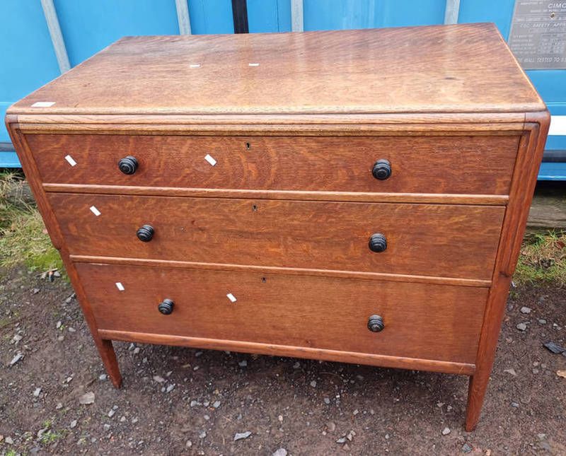 Early 20th century oak chest with 3 graduated drawers on square tapered supports attributed to bath cabinet makers - 77 cm tall x 91 cm wide