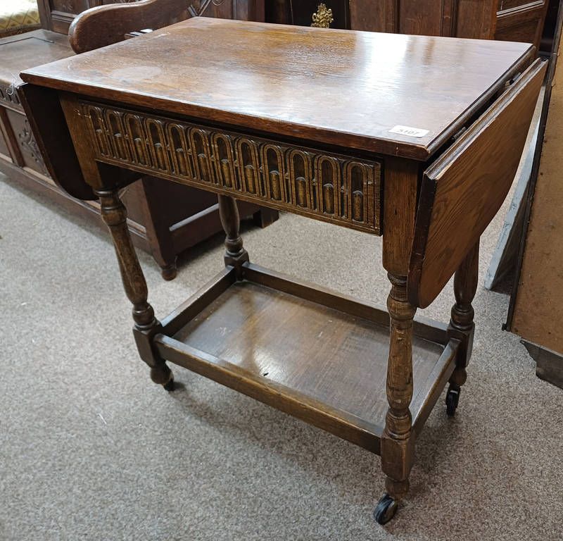 Mahogany 2 tier trolley with drop flaps, faux rosewood lidded box, coffee table, etc.