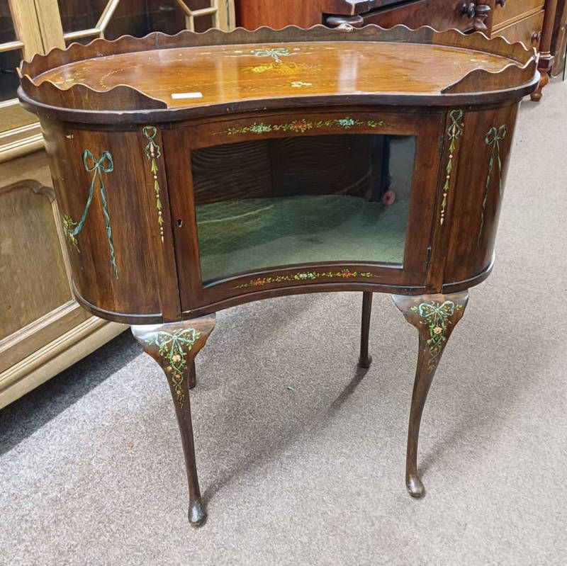 Early 20th century mahogany kidney shaped cabinet with 3/4 gallery tray, floral painted decoration & glazed panel door on shaped supports - 80 cm tall