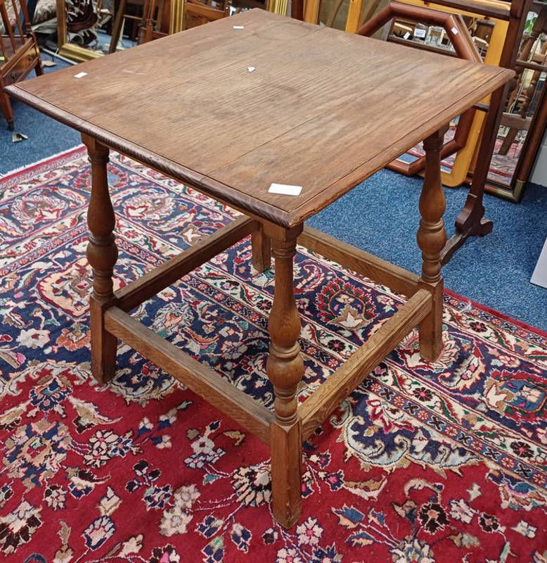 Oak square table on turned supports by wylie & lochhead ltd. makers plaque to underside - 60 cm wide