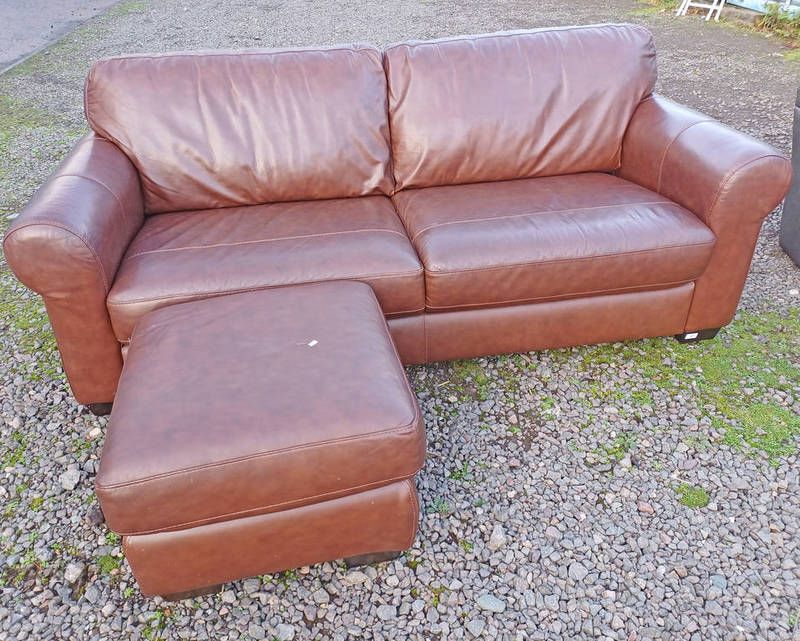 Brown leather 3 seater with matching footstool