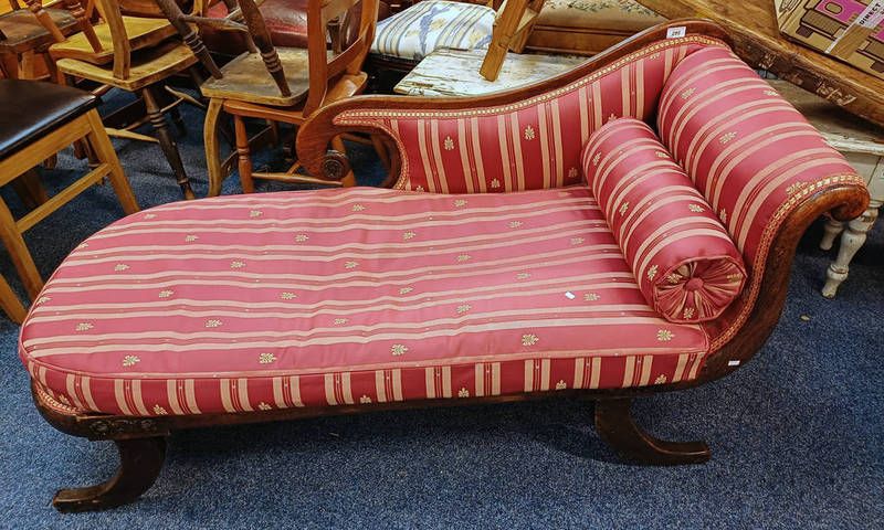 19th century mahogany framed chaise longue with decorative carving on reeded supports