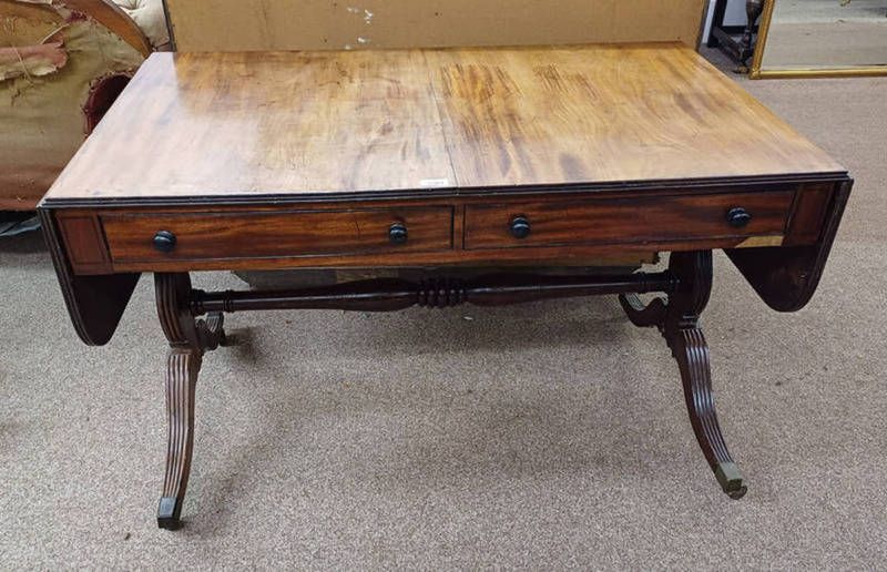 Late 19th century mahogany sofa table with ebony line inlay & 2 drawers on shaped supports - 115 cm wide