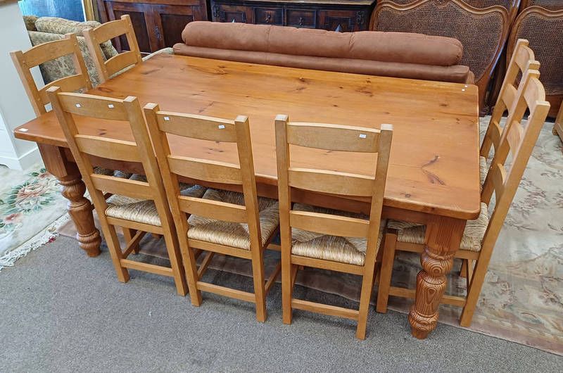 Large pine kitchen table on turned supports & set of 7 ladder back dining chairs - table 203 cm long