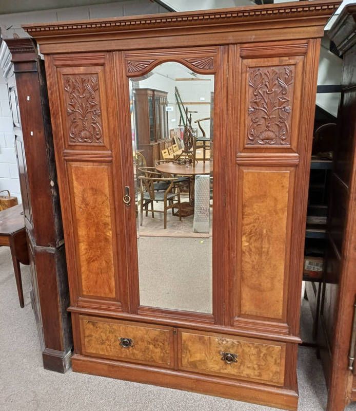 Late 19th century walnut mirror door wardrobe with single long drawer to base - 210 cm tall