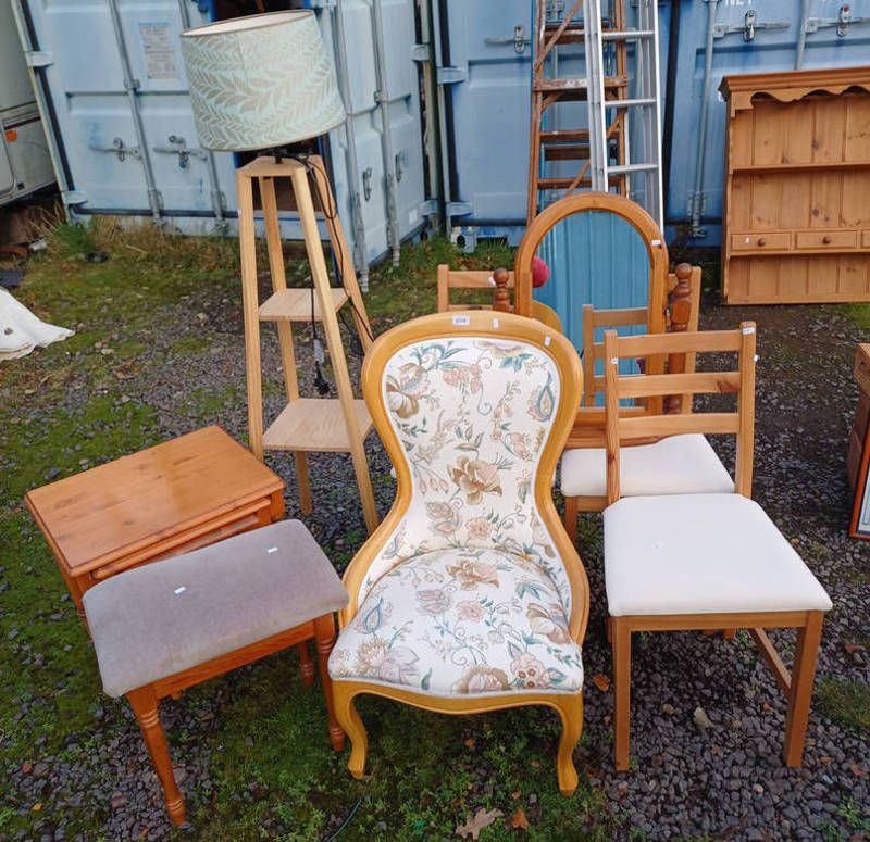 Nest of 3 pine tables, ladies chair, 3 pine dining chairs, etc