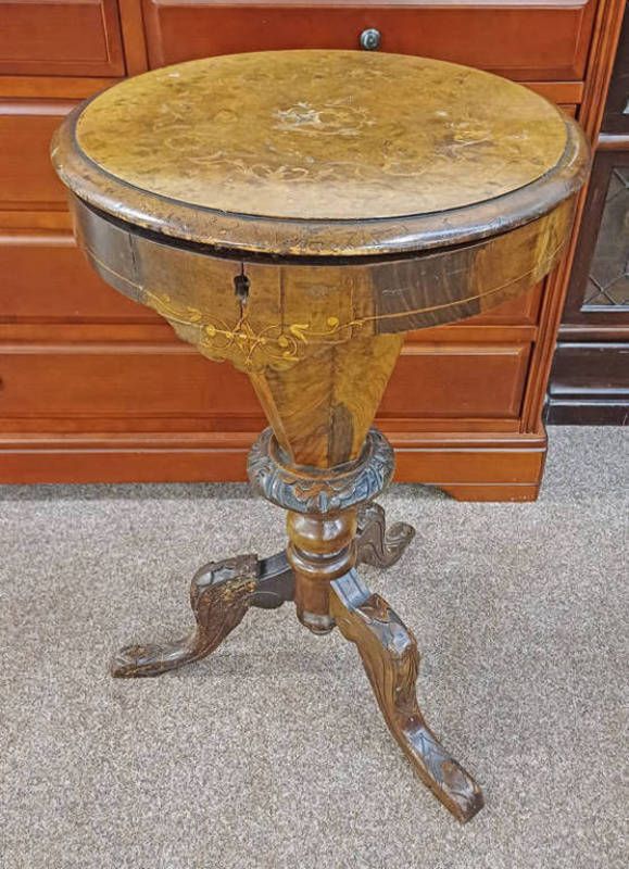 19th century inlaid walnut sewing table with lift lid top opening to fitted interior on 3 carved spreading supports. 74 cm tall