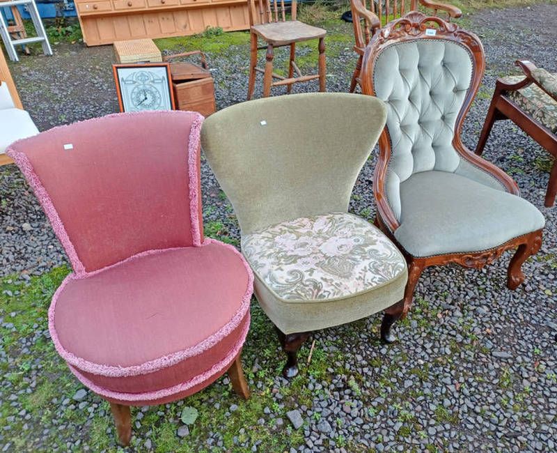 Beech framed button back ladies chair on cabriole supports & 2 other chairs