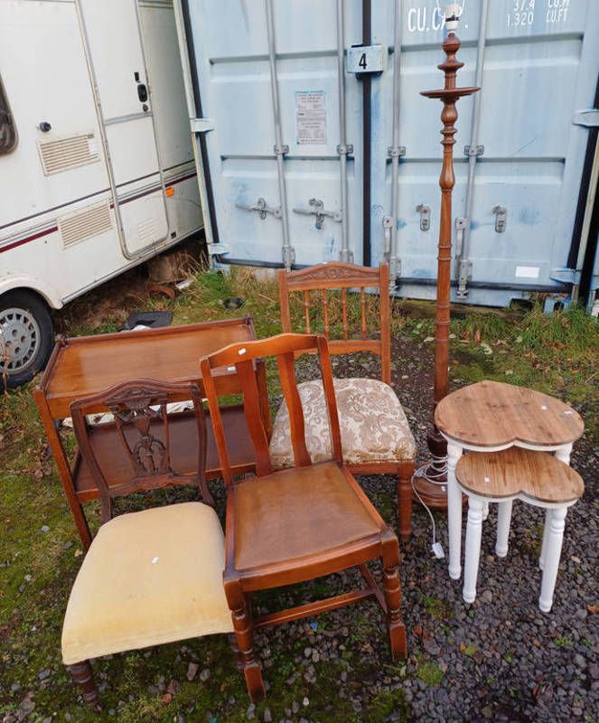 Mahogany 2 tier trolley , 2 heart topped occasional tables etc.