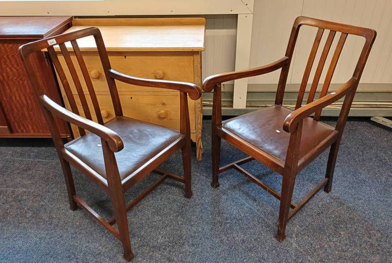 Pair of late 19th or early 20th century mahogany open armchairs with satin wood inlay...