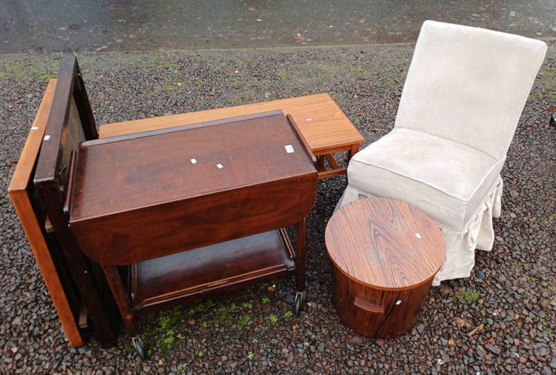 Mahogany 2 tier trolley with drop flaps, faux rosewood lidded box, coffee table, etc.